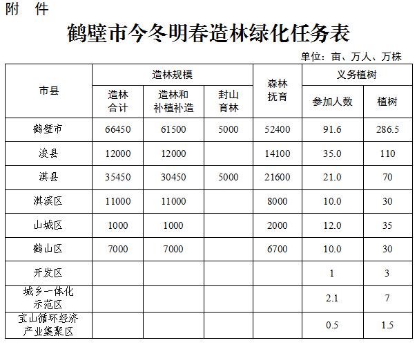 为进一步巩固全市林业生态及提升工程建设成果,按照《鹤壁市人民政府关于印发鹤壁市“五林共育”等5个五年行动计划的通知》(鹤政〔2016〕39号)要求,结合我市今冬明春造林工作实际,制定如下工作方案。